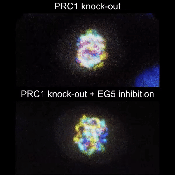 Spindle elongation depends on the joint activity of the motor EG5/kinesin-5 and the microtubule crosslinker PRC1. Without them, elongation is completely blocked, which is visible from this movie with chromosomes stained by SiR-DNA and color-coded for depth